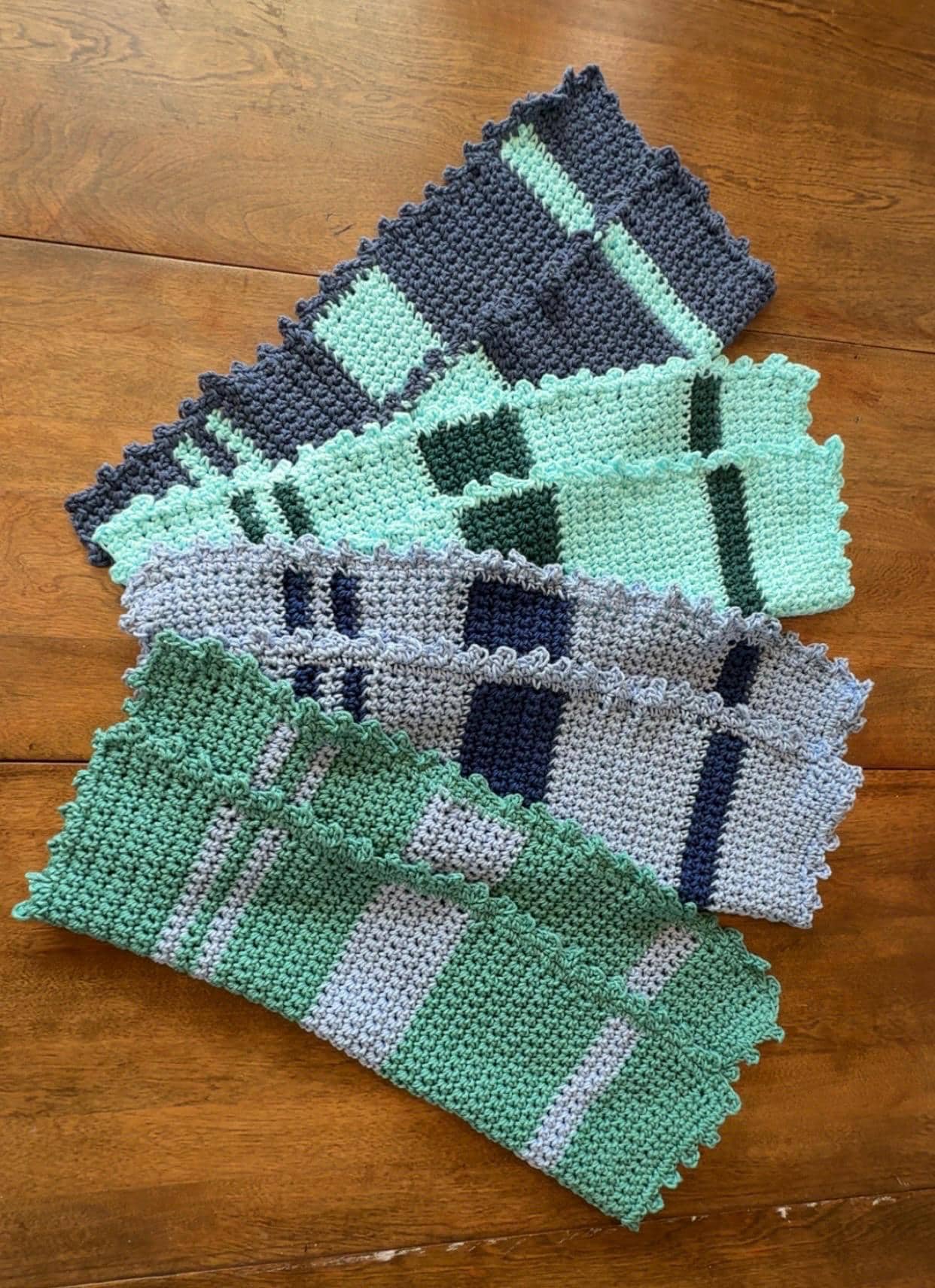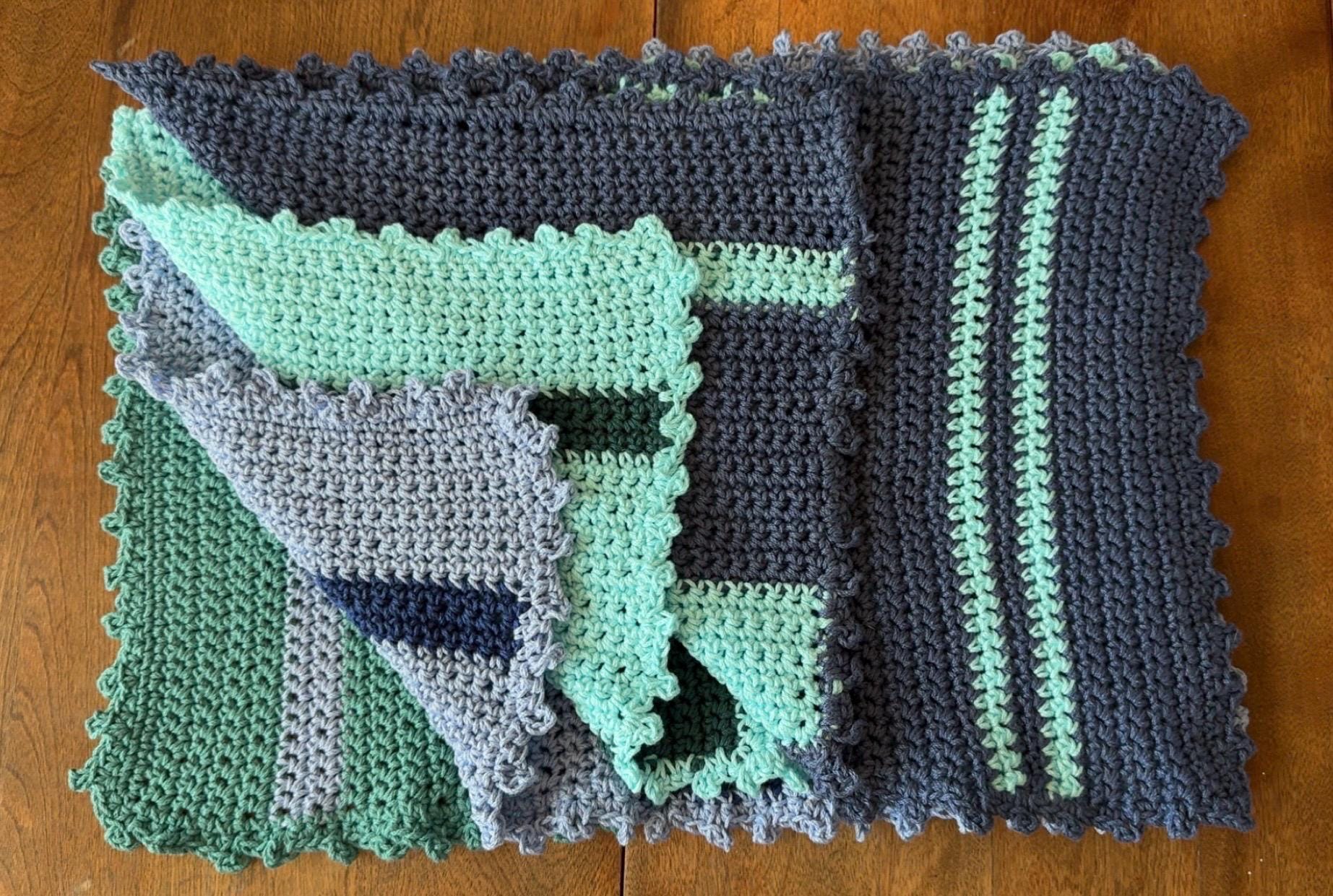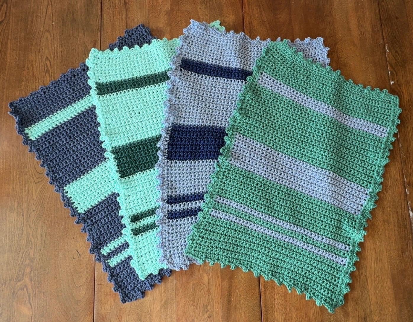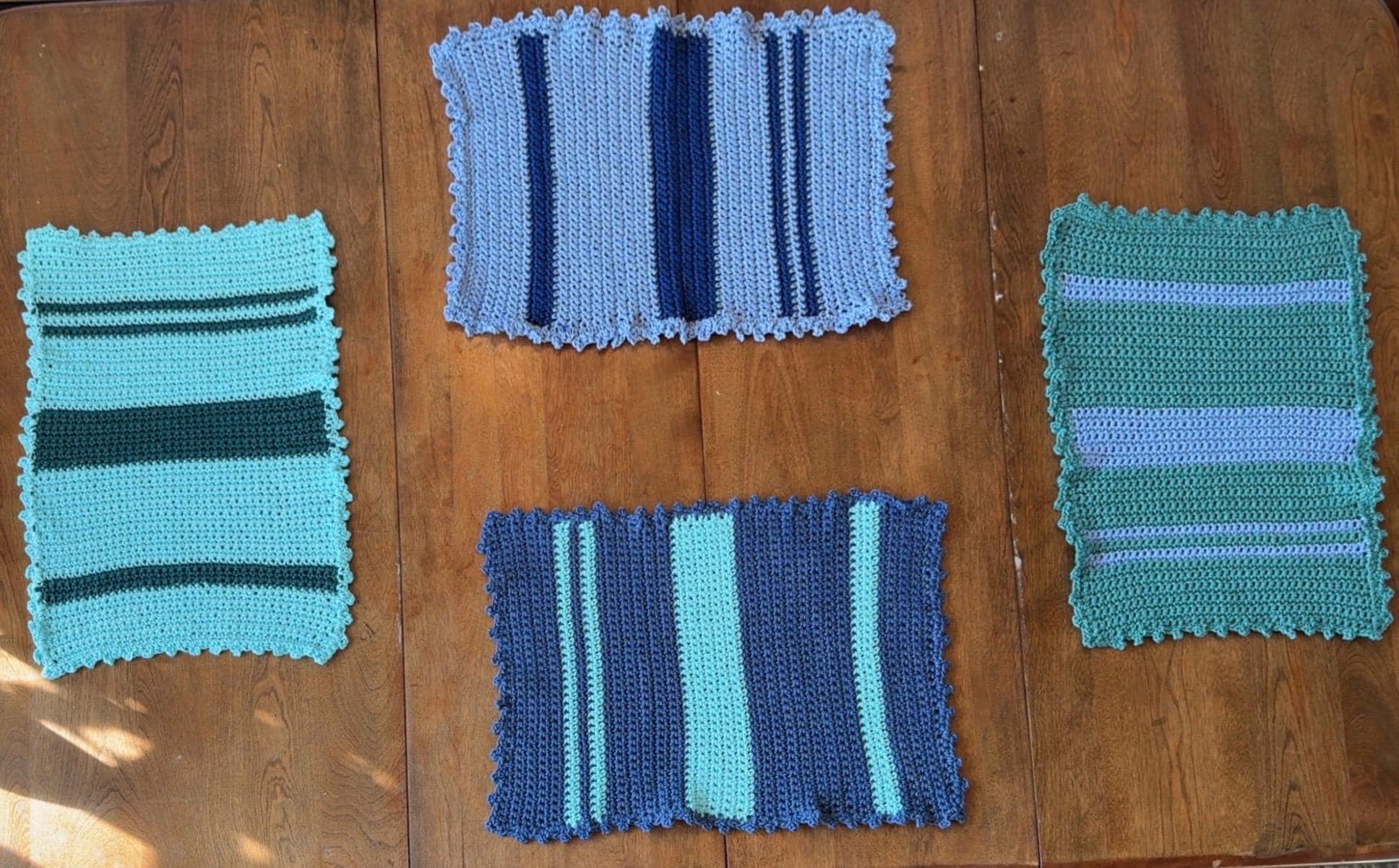 Set of four recycled cotton hand crocheted placemats. Machine wash and dry.
