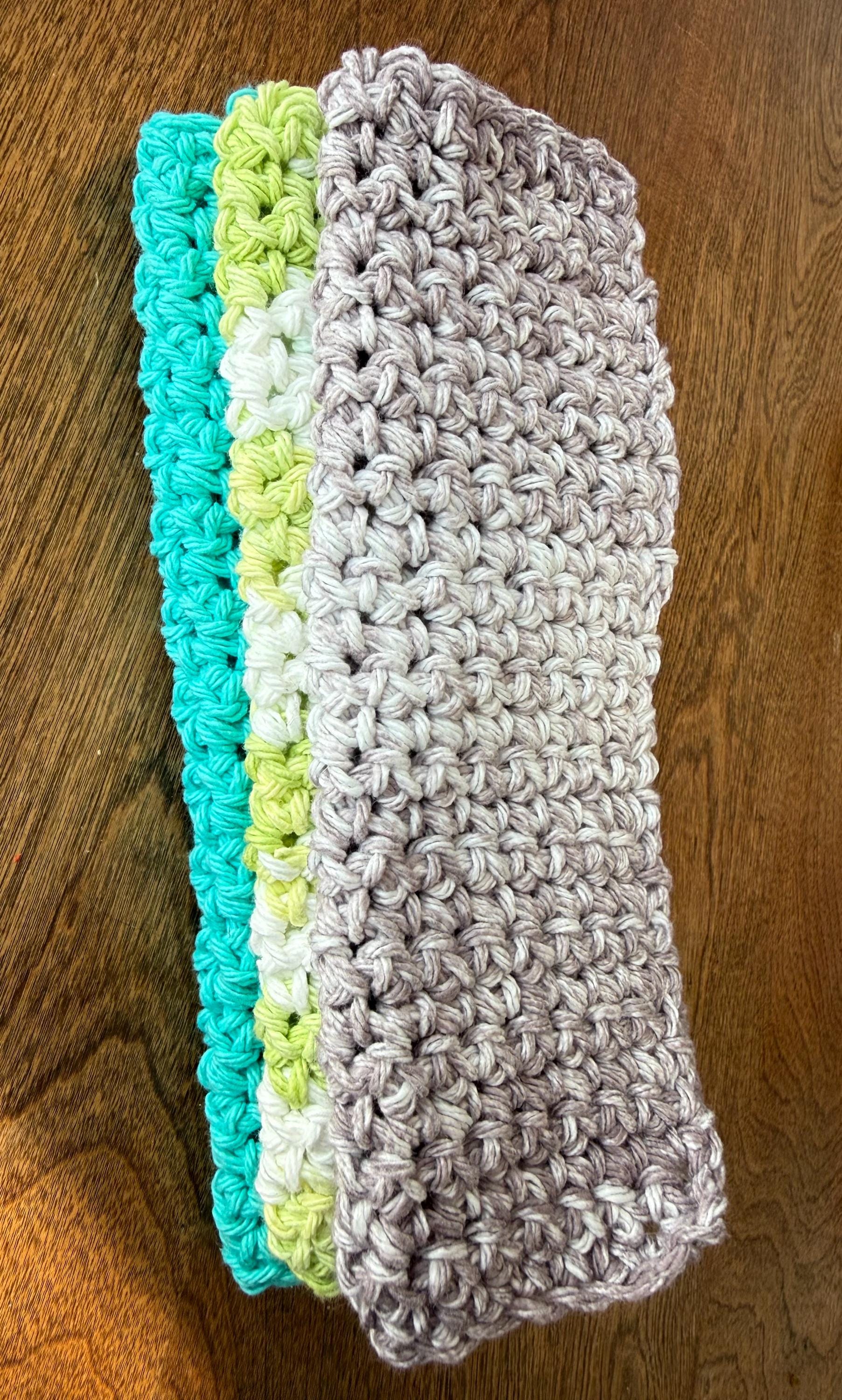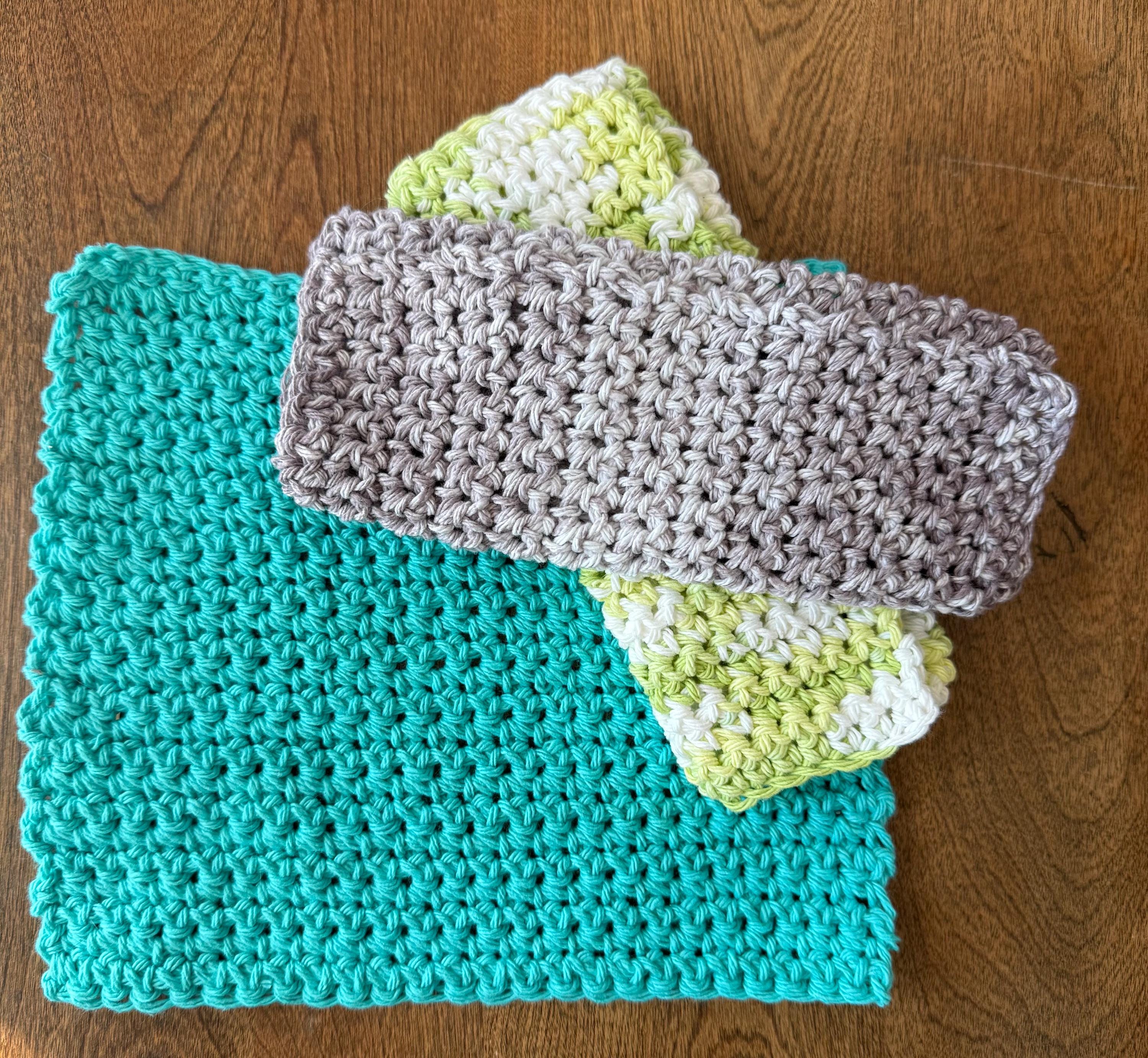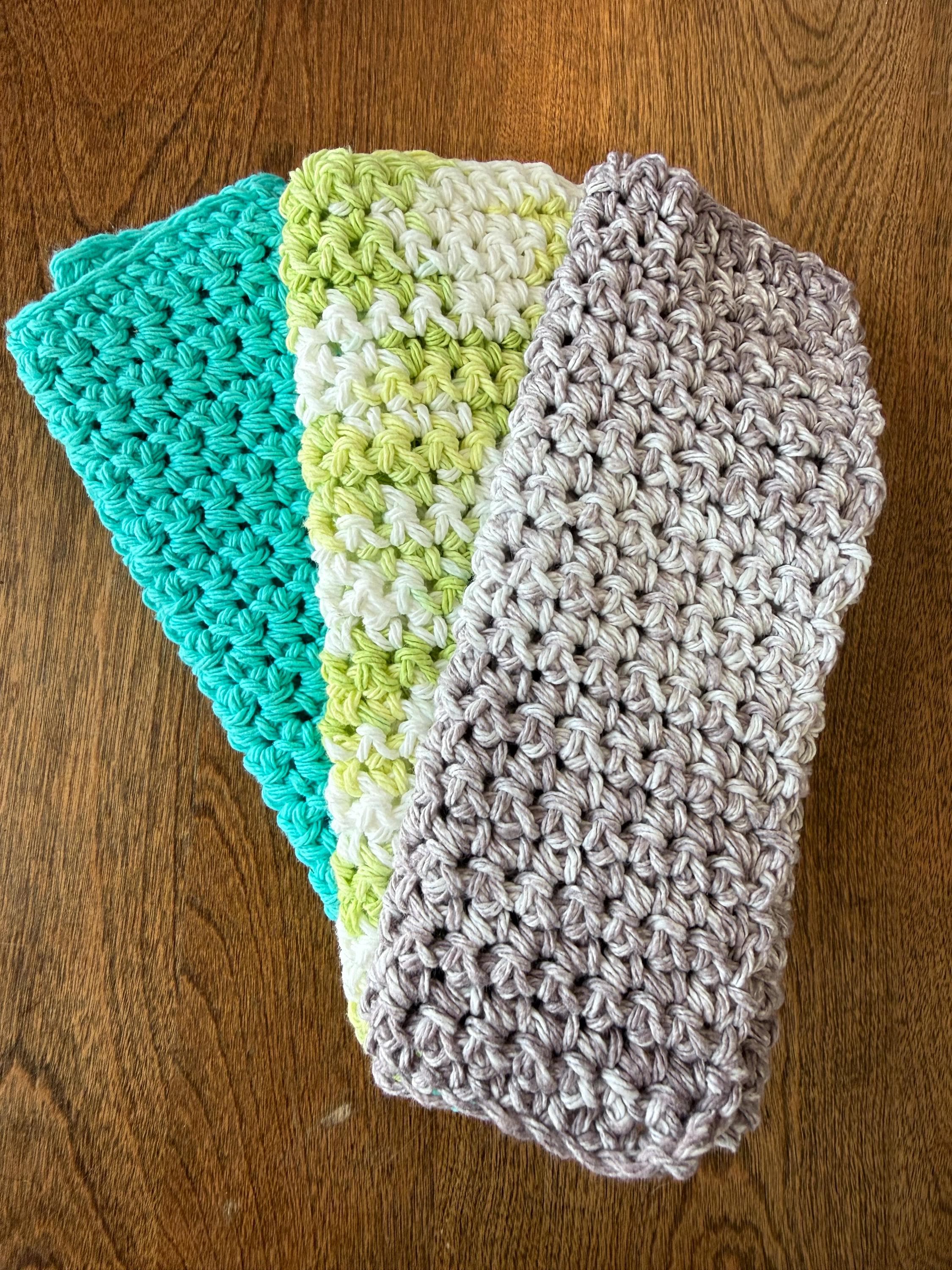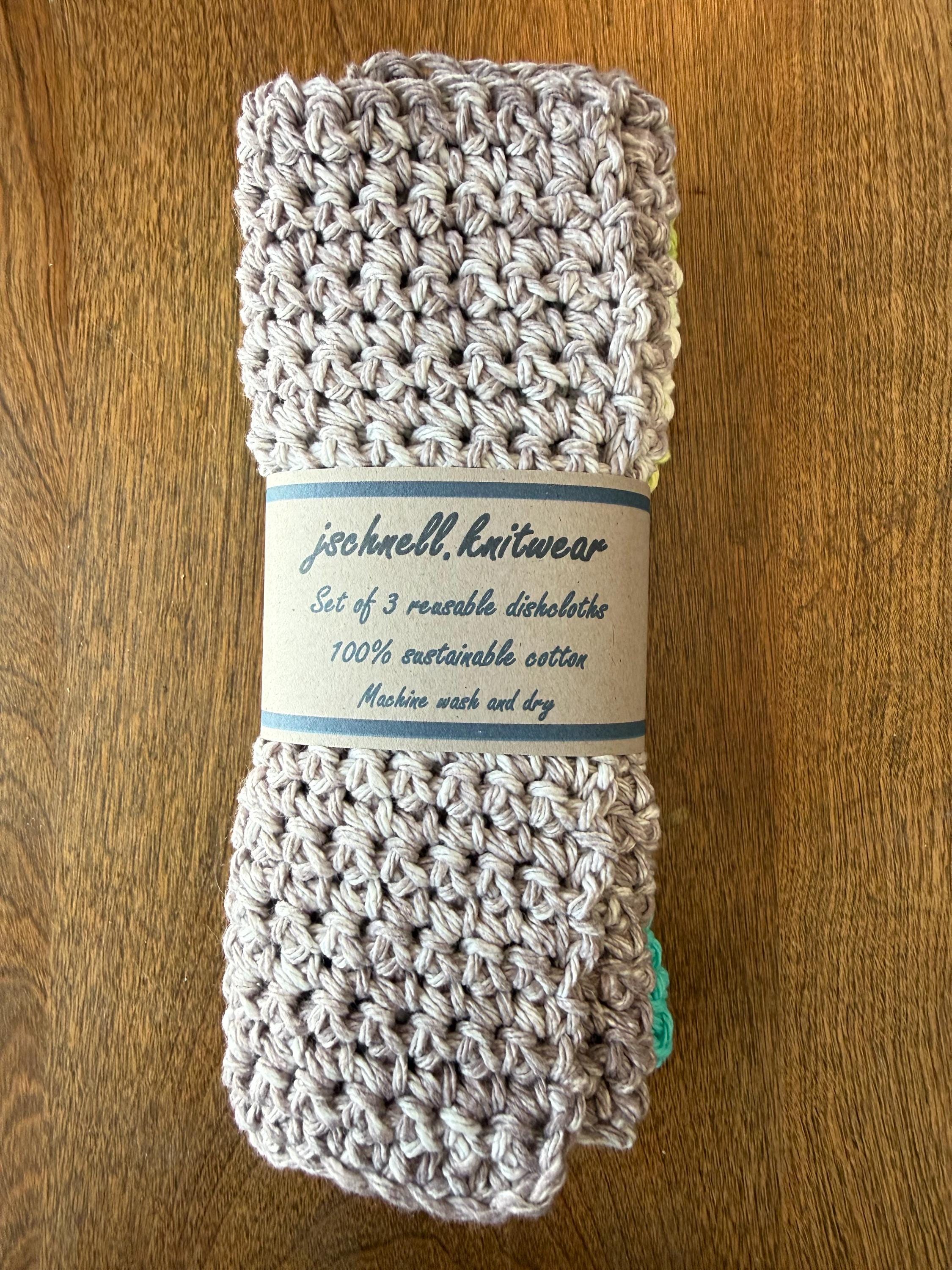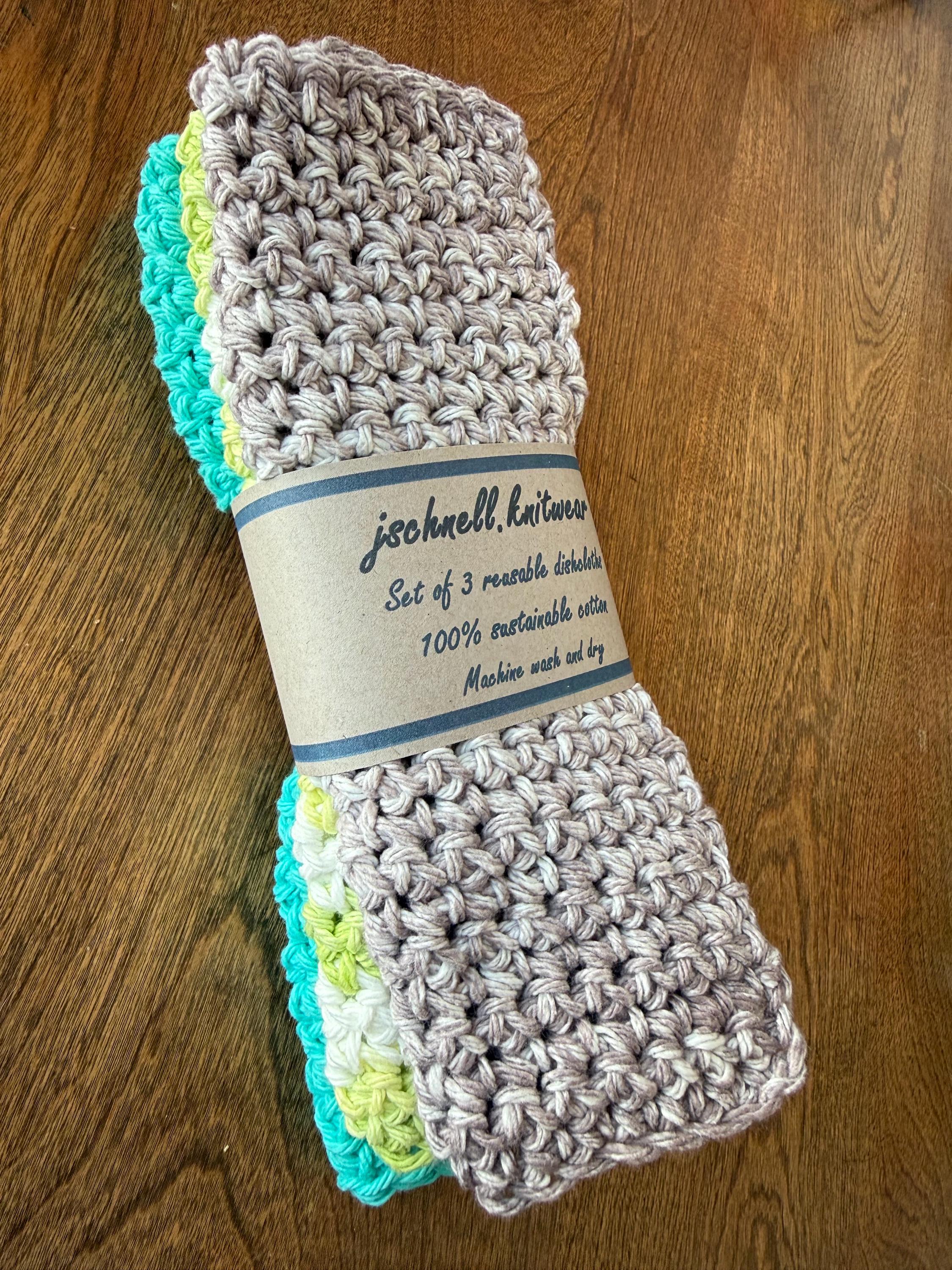 Set of 3 cotton dishcloths 100% sustainable cotton in stone, spring green and aqua